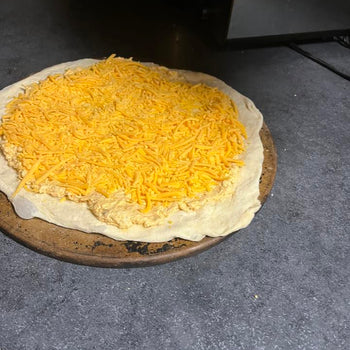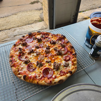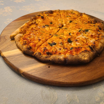 Hand stretch or toss the dough for a 12” or a thin crust 14” pizza.